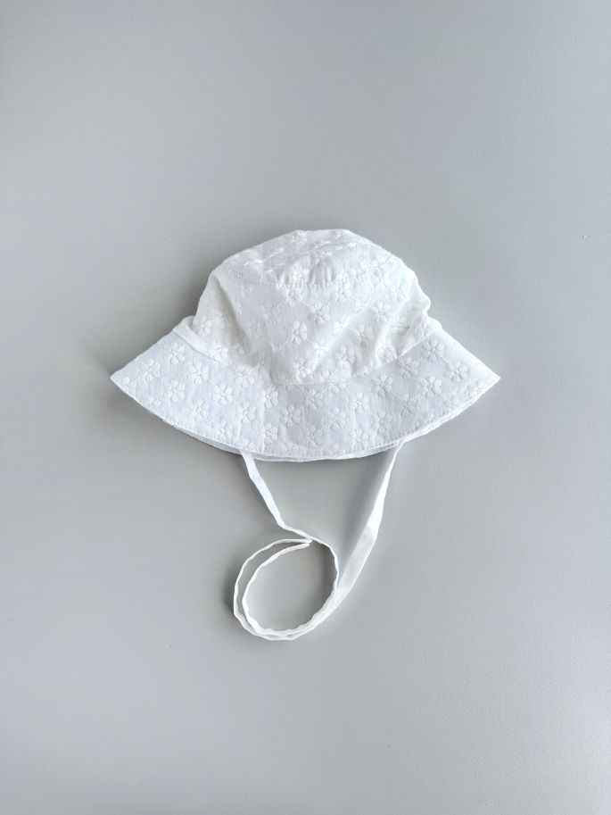 Однотонна панама із зав’язками, пошита з якісного батисту та вишивкою. Гарно закриває від сонця голівку та обличчя дитини