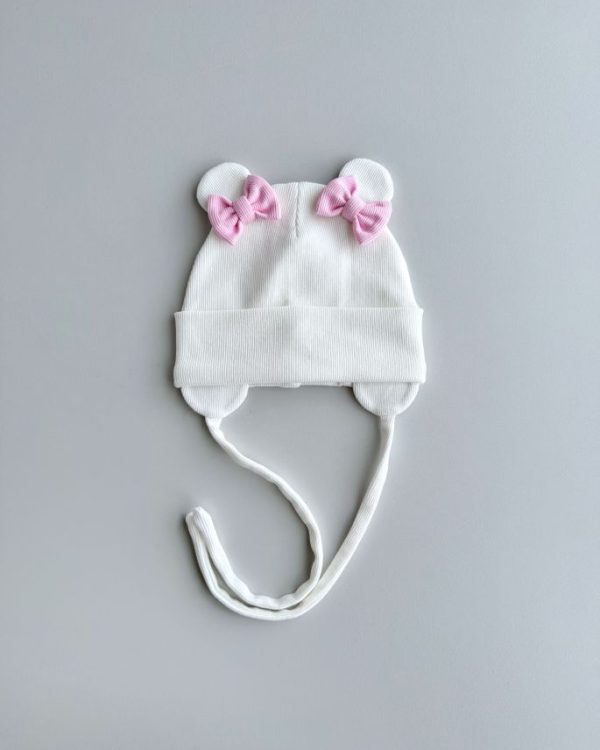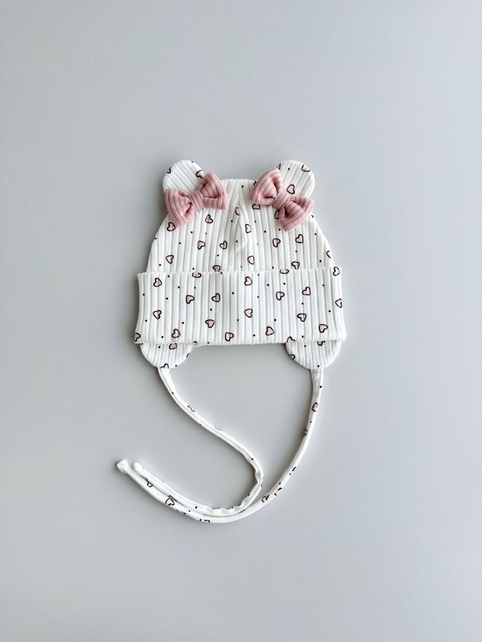 Шапочка МІНІ СЕРДЕЧКА – молочний з рожевими бантиками