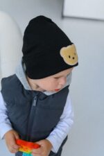 Двошарова шапочка в рубчик, еластична, гарно тягнеться. Ведмедик пришитий.